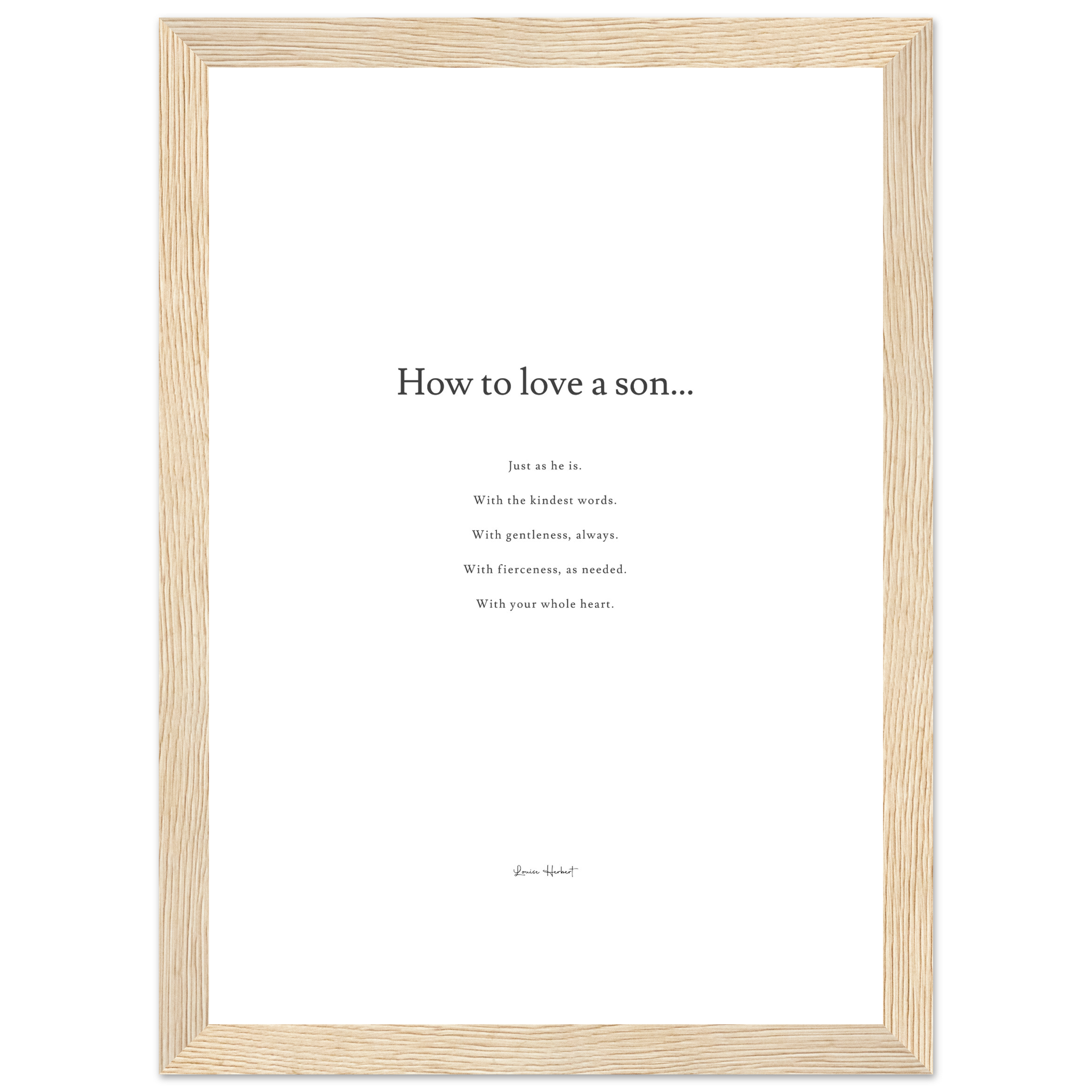 This special edition framed print of Louise's poem, How to love a son, arrives ready-to-hang in its solid wood frame.