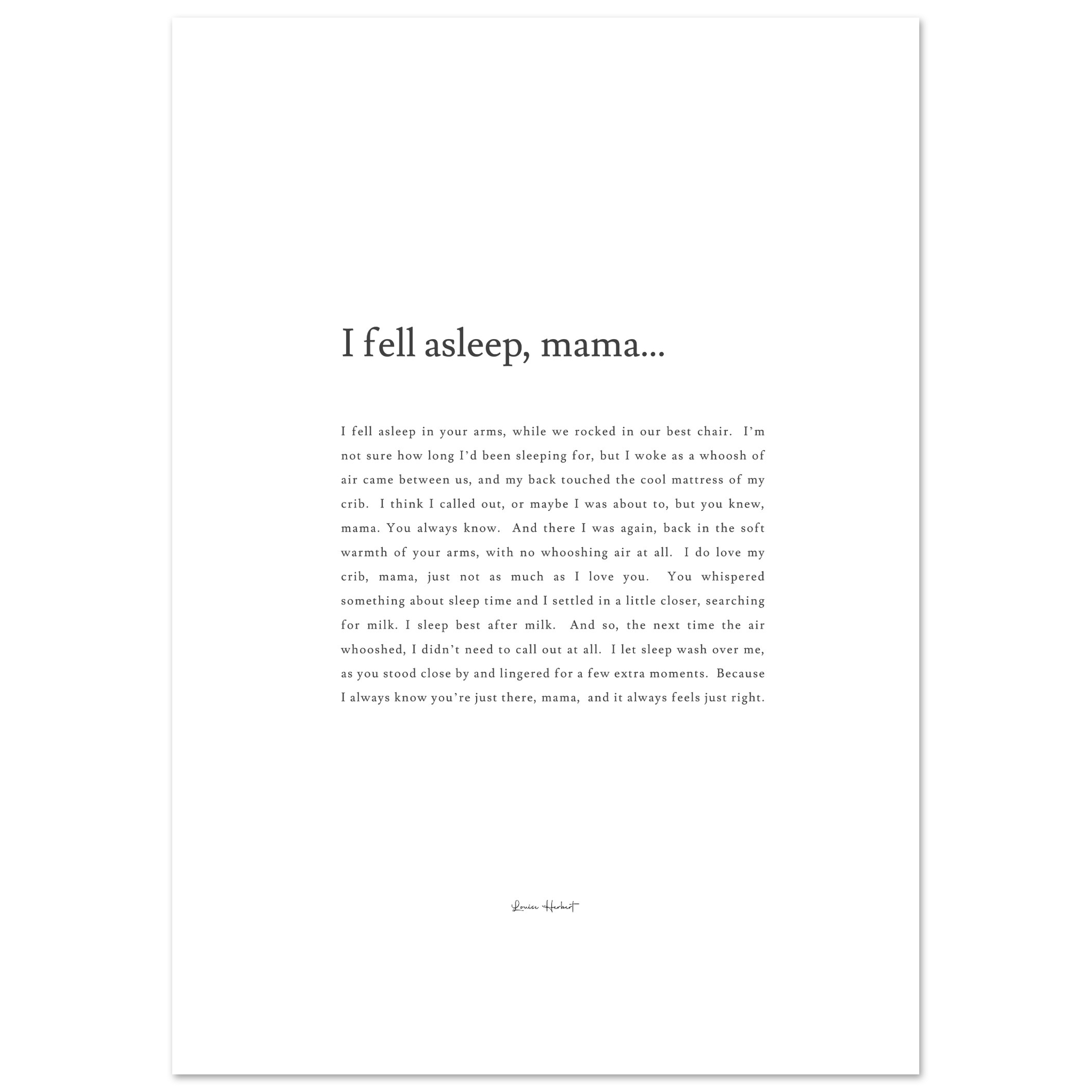 This beautiful print of Louise's poem, I Fell Asleep, Mama, is printed on 200gsm soft white premium matte paper.
