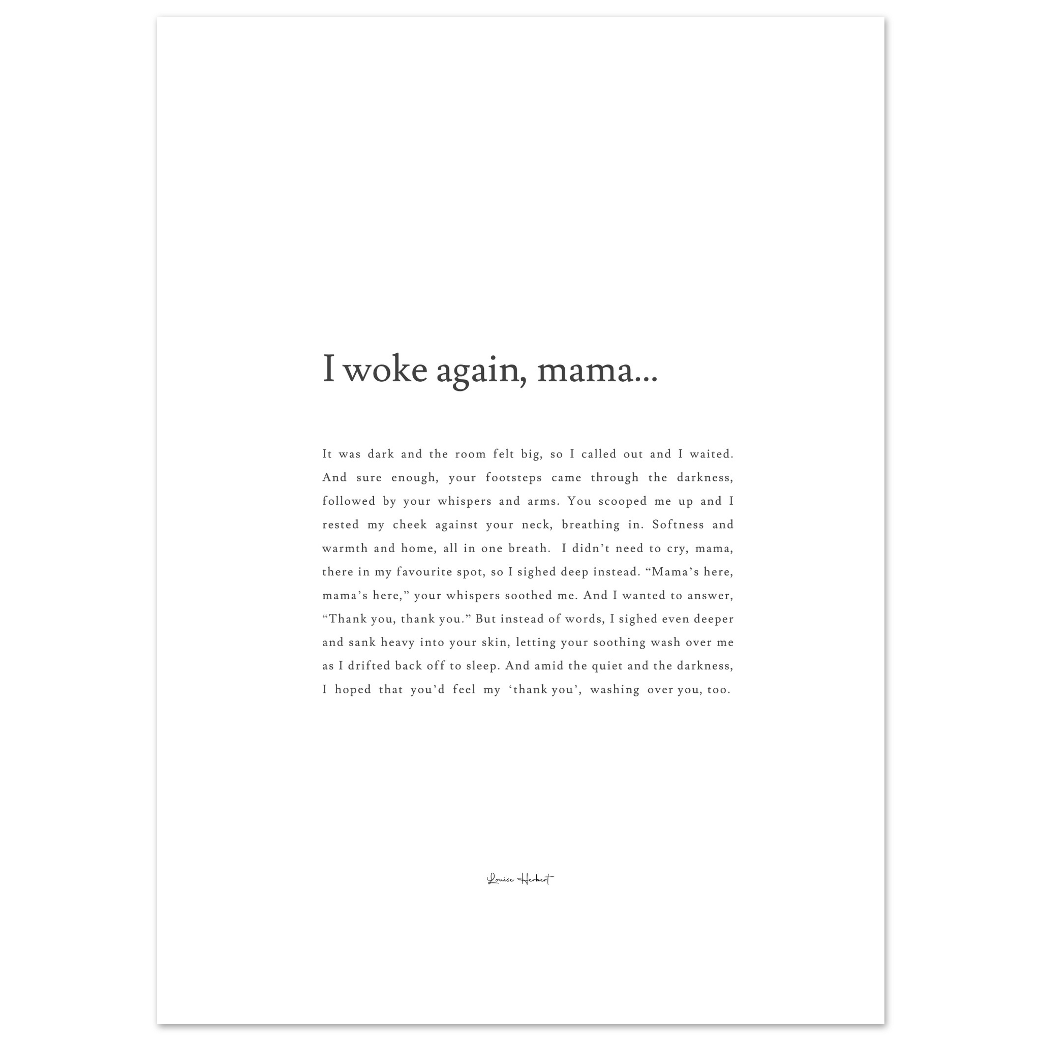This beautiful print of Louise's viral poem, I Woke Again, Mama, is printed on 200gsm soft white premium matte paper.