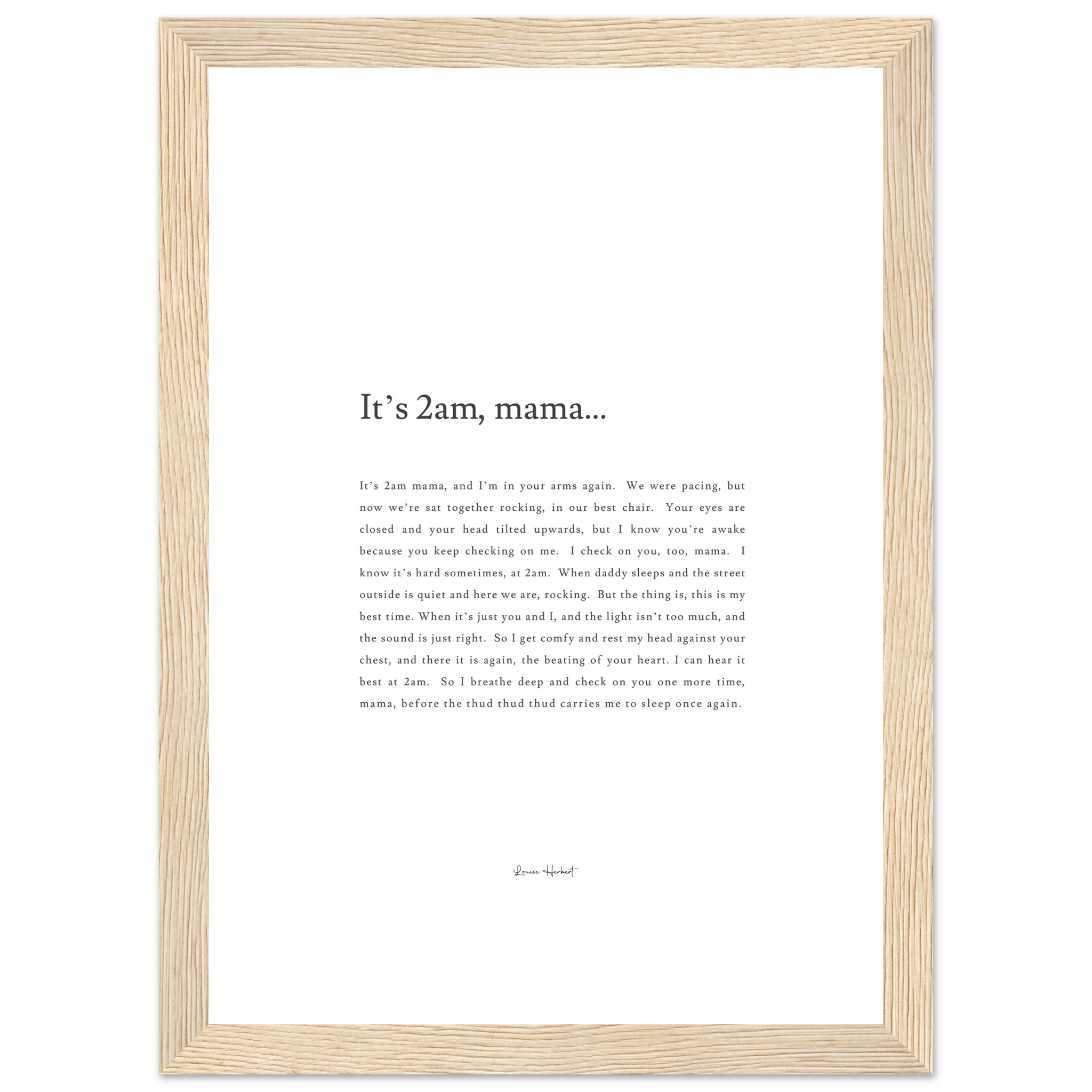 This beautiful framed print of Louise's viral poem, It's 2am, Mama, arrives ready-to-hang in its solid wood frame.