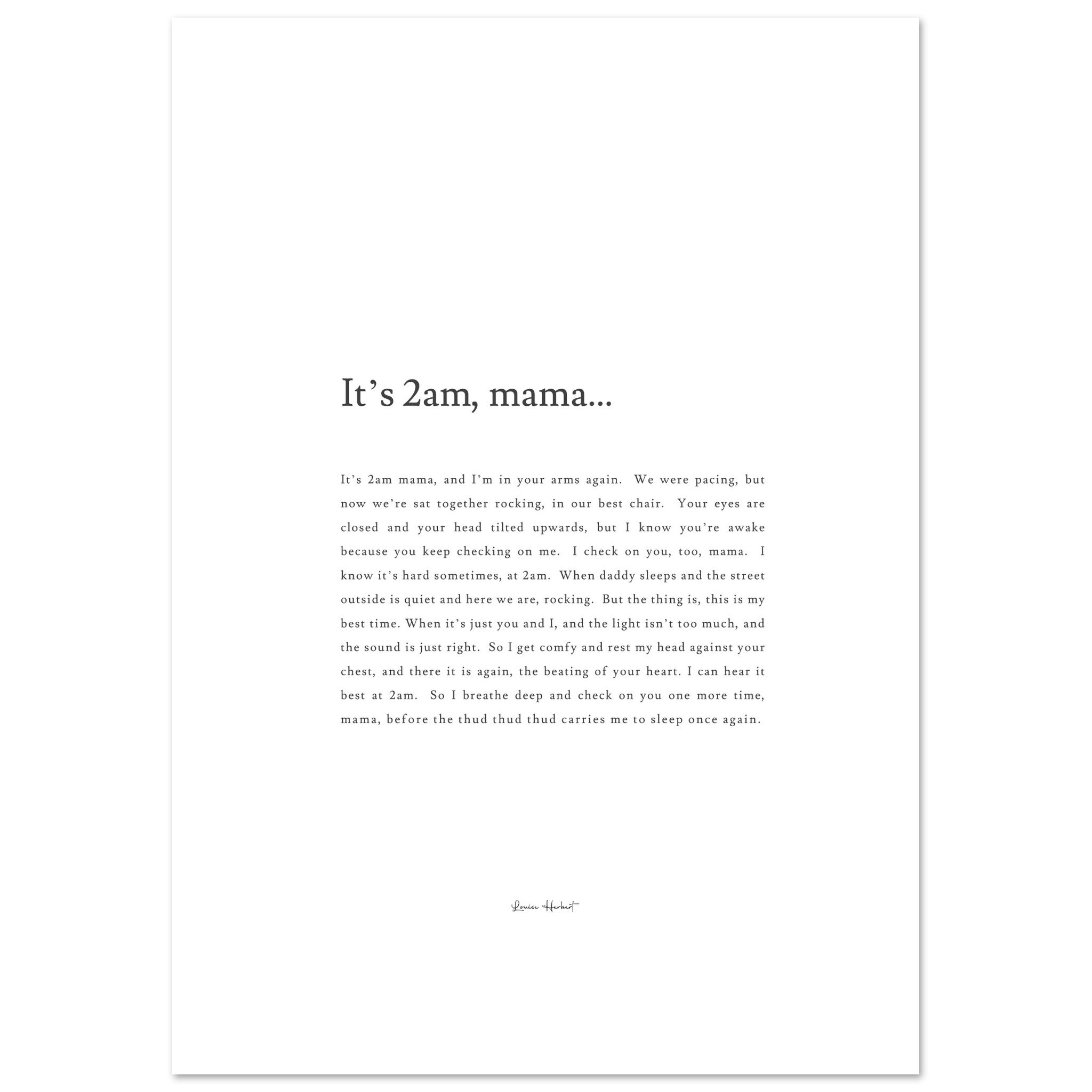 This beautiful print of Louise's viral poem, It's 2am, Mama, is printed on 200gsm soft white premium matte paper.