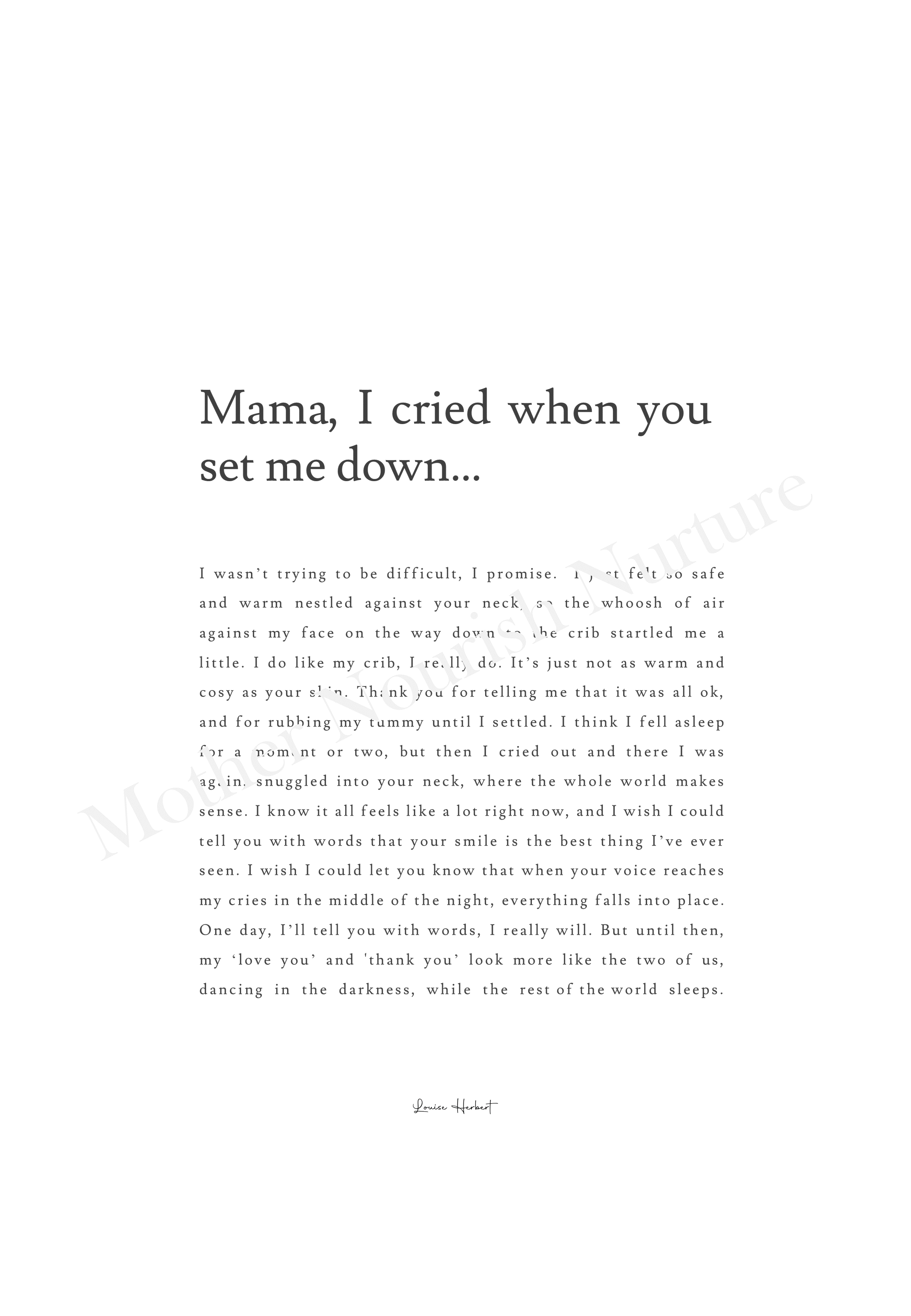 This special edition digital version of Louise's poem, Mama, I Cried When You Set Me Down, is provided as a high quality downloadable file.